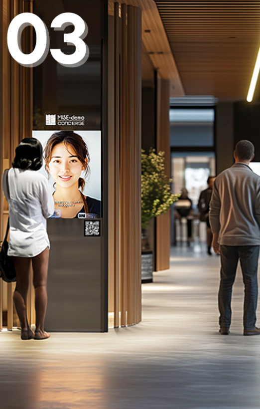 MISEdemoコンシェルジュは、施設案内・サービス紹介・商品の魅力などを、来店者が自分のペースでストレスなく得られるバーチャルヒューマンが接客するタッチ式サイネージです。